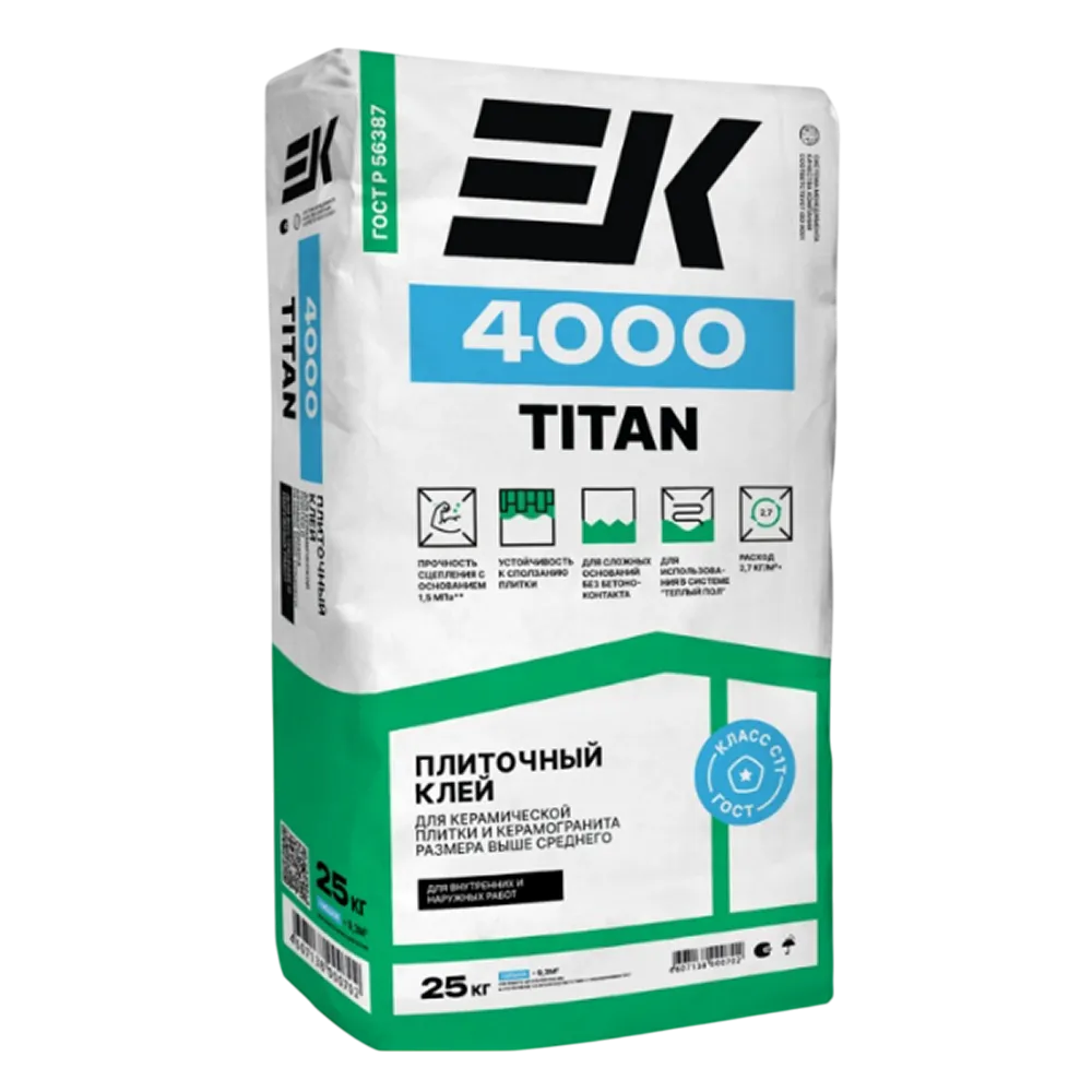 Клей для керамической плитки и керамогранита ЕК 4000 Titan — это высококачественный клей для укладки плитки и камня, предназначенный для работ как внутри помещений, так и снаружи. Он подходит для керамогранита, природного и искусственного камня с любым водопоглощением, мозаики, а также керамической плитки среднего и вытянутого формата.