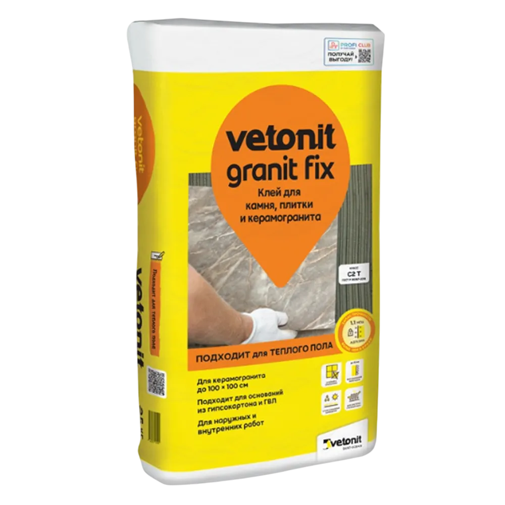 Использование Vetonit Granit Fix С2 T гарантирует надежное и долговечное крепление керамогранита, керамической и клинкерной плитки, а также мозаики на любых стандартных основаниях, включая поверхности с повышенной влажностью или системы «Теплый пол».