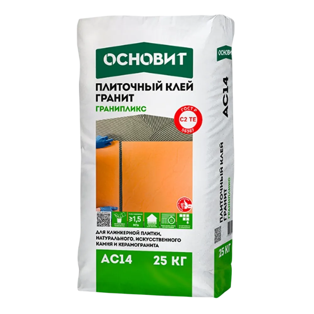 Клей цементный С2 ТЕ Основит Гранипликс AC14 (Т-14) — это профессиональный материал для укладки тяжелых плит и камня. Предназначен для керамогранита, натурального и искусственного камня, включая клинкерную плитку, а также керамическую плитку весом до 800 г/100 см². Клей обеспечивает прочное и надежное сцепление с основанием, подходя как для внутренних, так и для наружных работ.