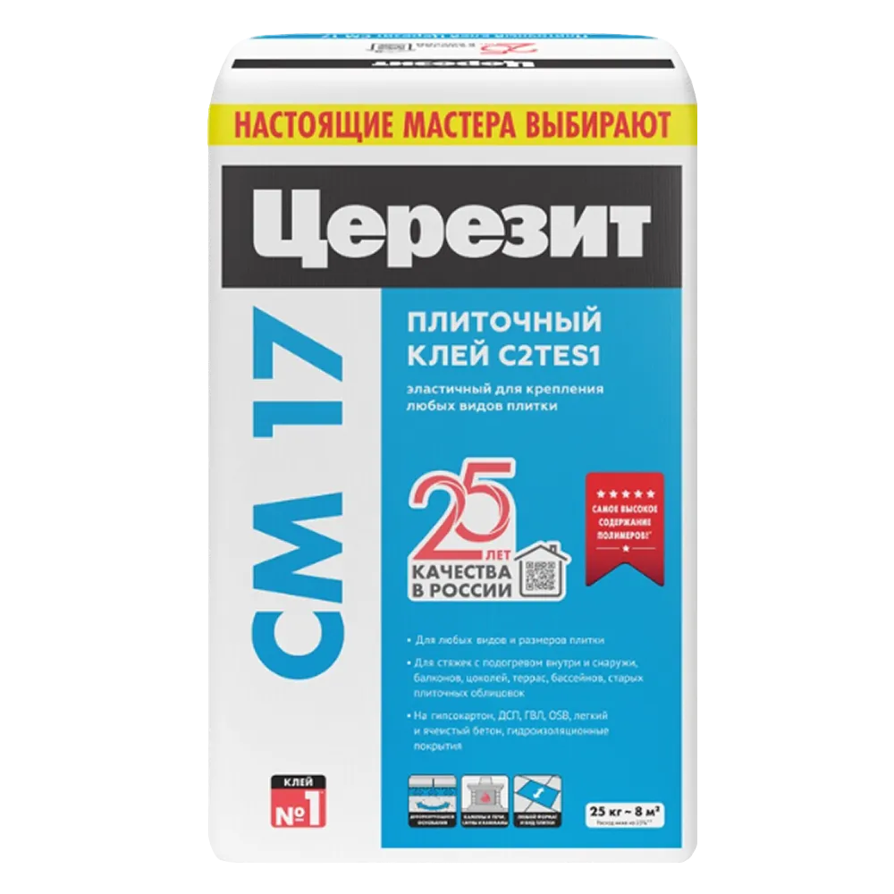 Клей для плитки Ceresit CM 17 предназначен для внутренних и наружных работ. Универсальный состав подходит для укладки как мелкой, так и крупной плитки, а также для большинства популярных покрытий, включая гипсокартон, ДСП и OSB плиты. Подходит для всех видов минеральной плитки.