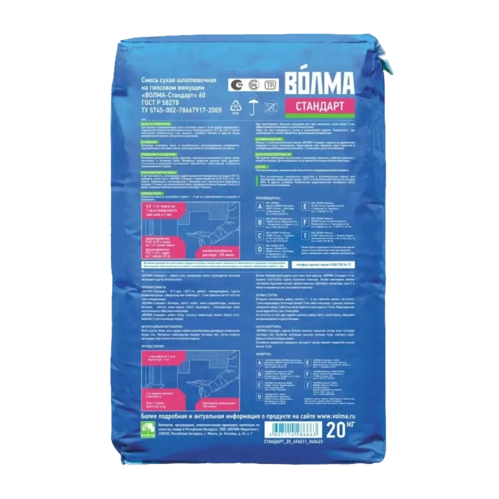 Шпаклевка гипсовая Волма Стандарт (20 кг) предназначена для базового выравнивания стен и потолков внутри сухих помещений любого назначения. Материал используется при подготовке оснований под оклейку обоями, покраску и другие виды декоративной отделки.