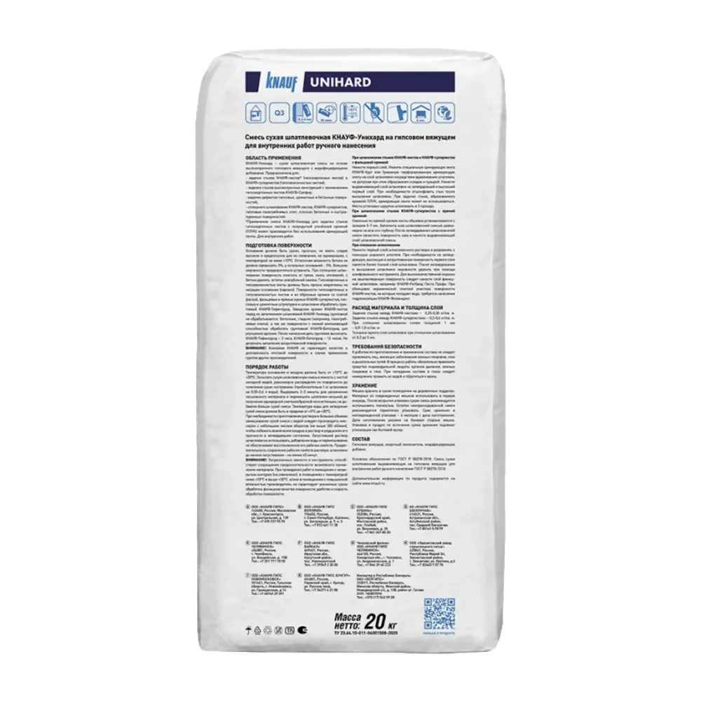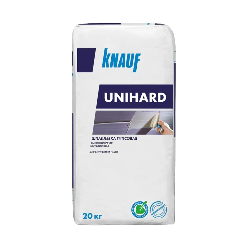 Knauf Unihard (20 кг) — гипсовая шпаклевка, предназначенная для заделки дефектов и сплошного выравнивания различных типов оснований. Материал используется для внутренних работ по гипсовым, цементным и бетонным поверхностям.
