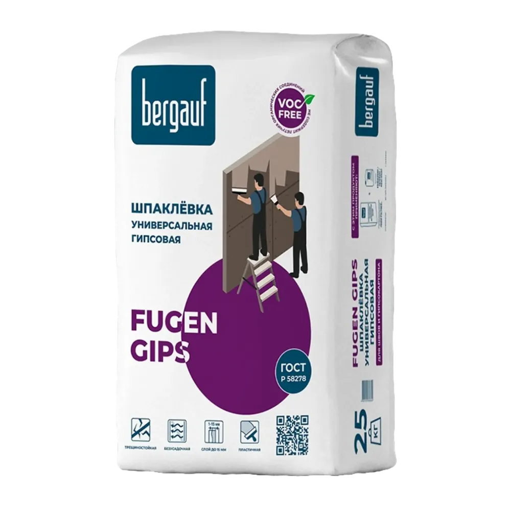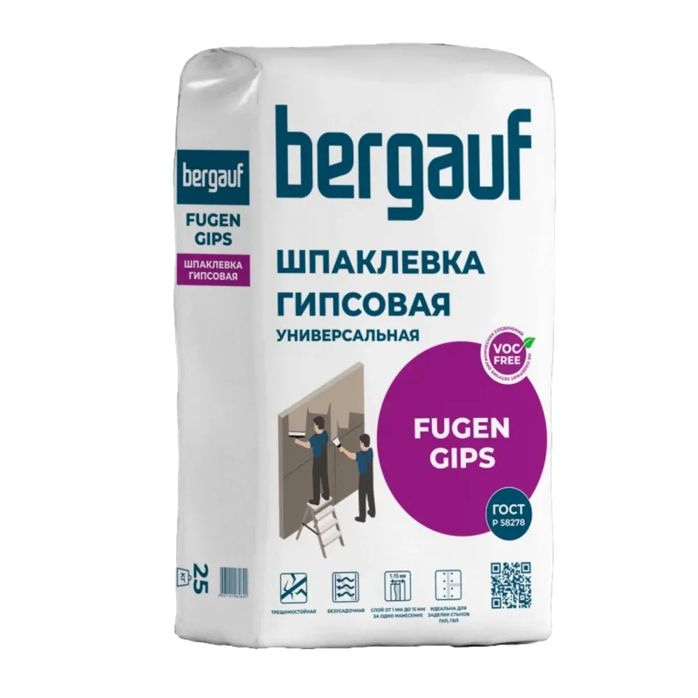 Bergauf Fugen Gips (25 кг) — гипсовая универсальная шпаклевка, предназначенная для внутренних работ в помещениях с нормальной влажностью. Состав применяется для выравнивания различных минеральных поверхностей и заделки швов между листовыми материалами.
