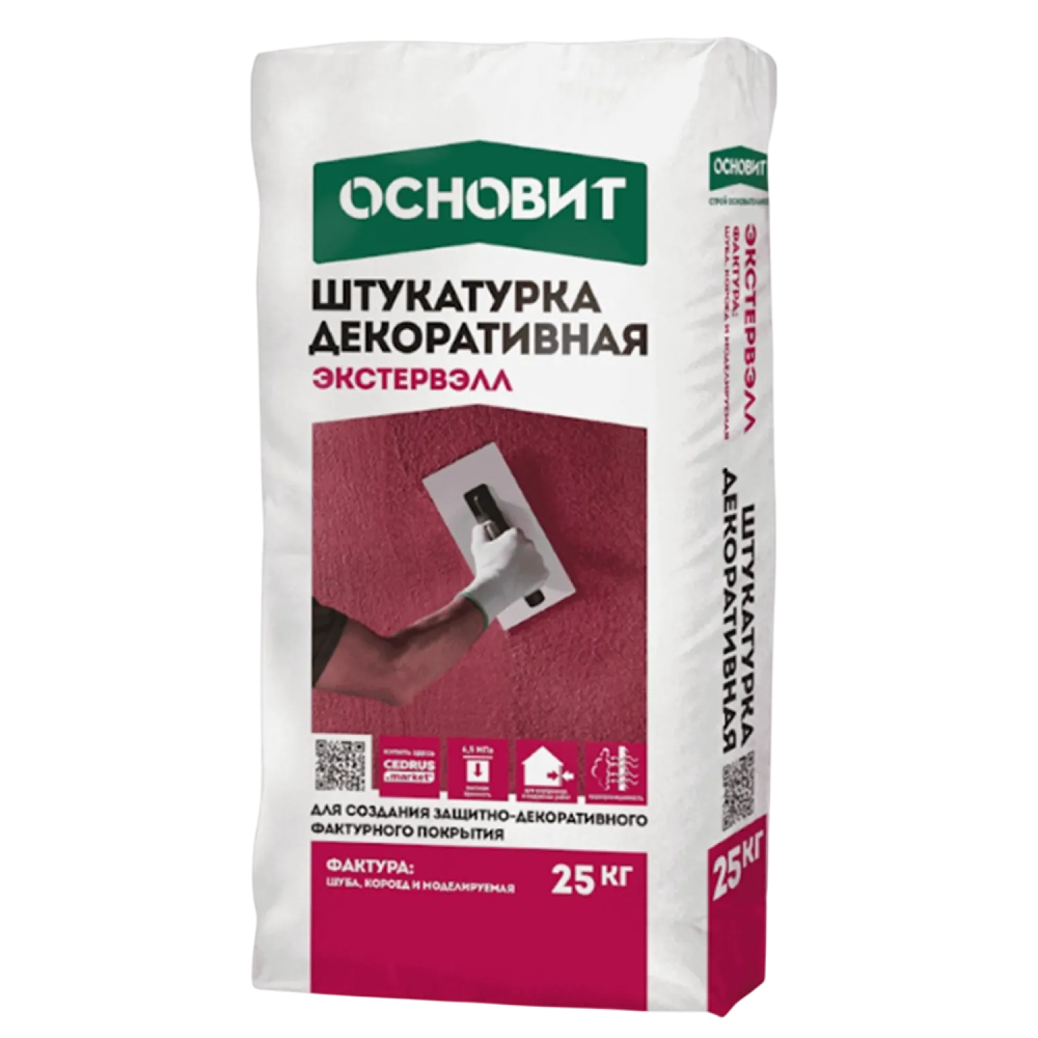 Штукатурка декоративная ОСНОВИТ ЭКСТЕРВЭЛЛ короед белая - декоративный состав на цементном вяжущем для фасадных теплоизоляционных композиционных систем с наружными штукатурными слоями (класс В5, Btb2,4, Aab3, F75, ГОСТ Р 54358-2017).