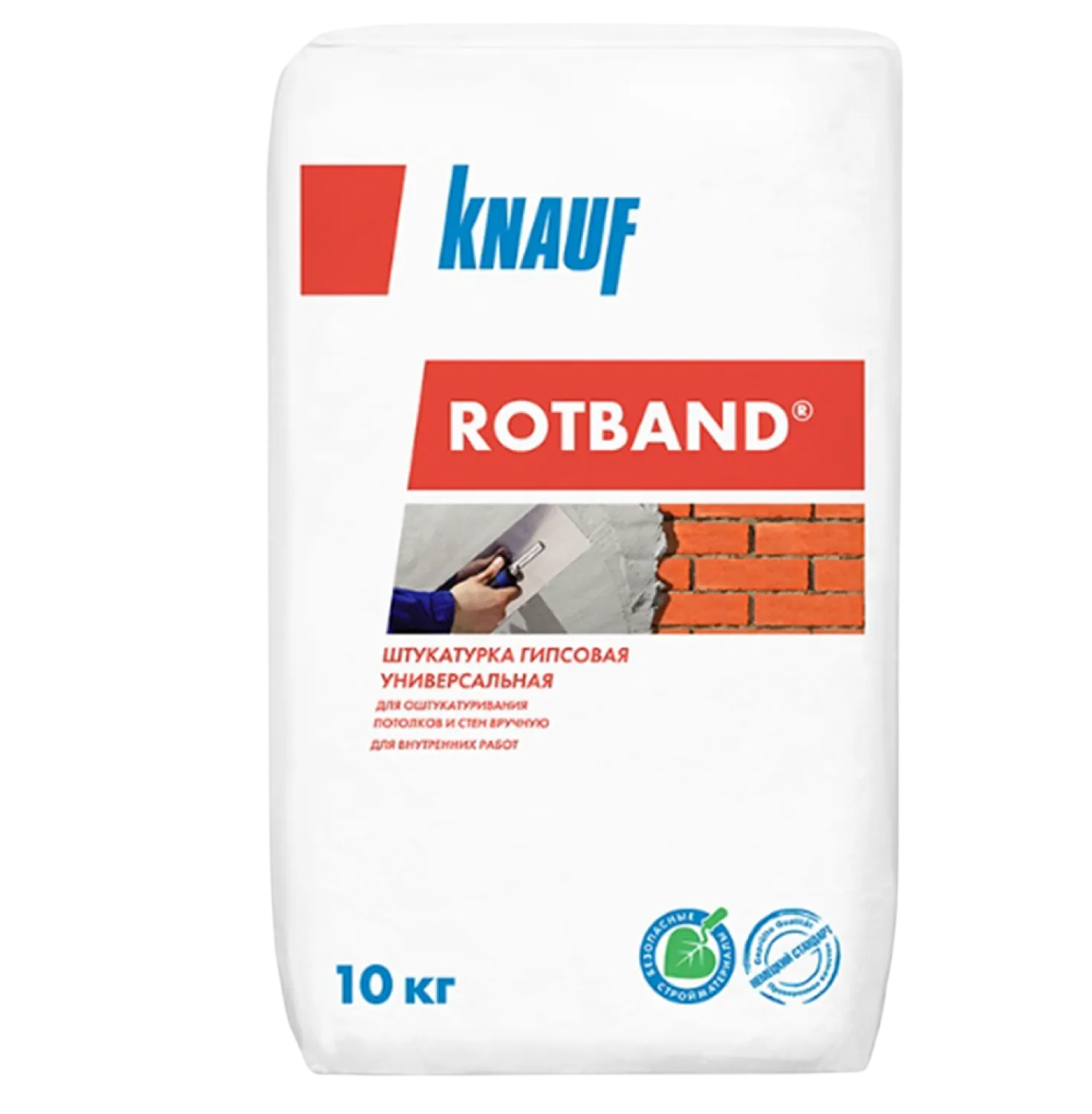 Knauf Rotband — универсальная сухая штукатурная смесь на основе гипса с добавлением полимерных компонентов, повышающих адгезию и пластичность раствора.